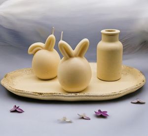 Zestawy wielkanocne – kompozycje, które łączą w sobie eleganckie podstawki z gipsu Jasmonite, świece sojowe i dekoracyjne figurki.
