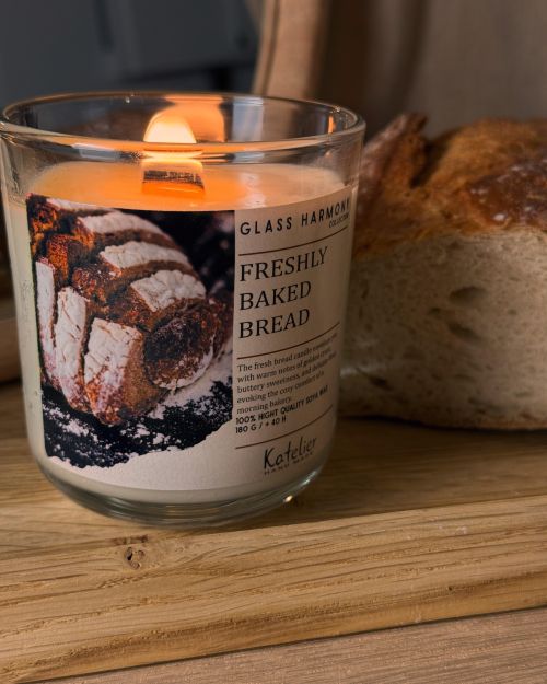 Jest coś magicznego w zapachu świeżo upieczonego chleba. Kojarzy się z porankiem bez pośpiechu, z kuchnią, gdzie rozchodzi się ciepło, z poczuciem bezpieczeństwa. Właśnie dlatego w maju przedstawiamy świecę, która przenosi Cię do tego wyjątkowego miejsca – Freshly Baked Bread z kolekcji Glass Harmony od Katelier.